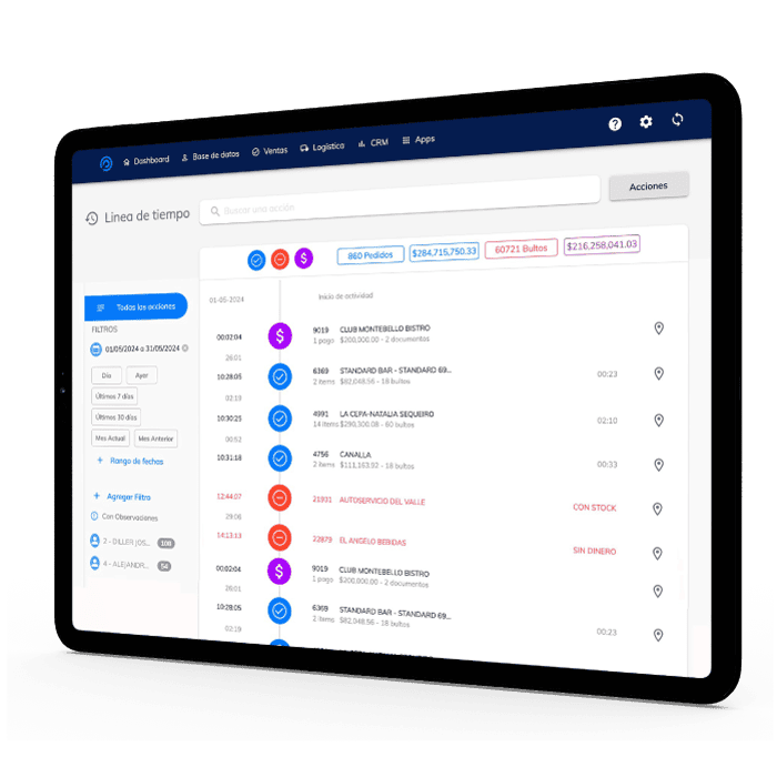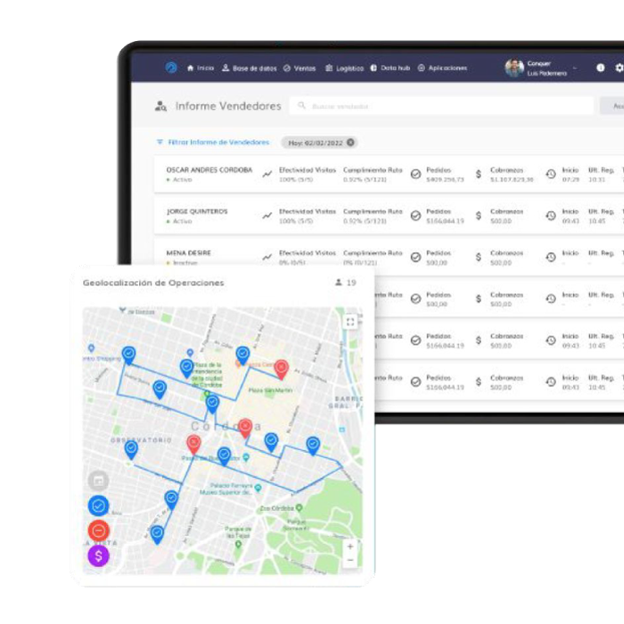 Estas posibilidades, permiten un análisis detallado desde nuestro SmartPanel del desempeño de cada vendedor y se pueden visualizar todas sus operaciones geolocalizadas en el mapa en tiempo real o hacer un seguimiento del recorrido de sus vendedores.